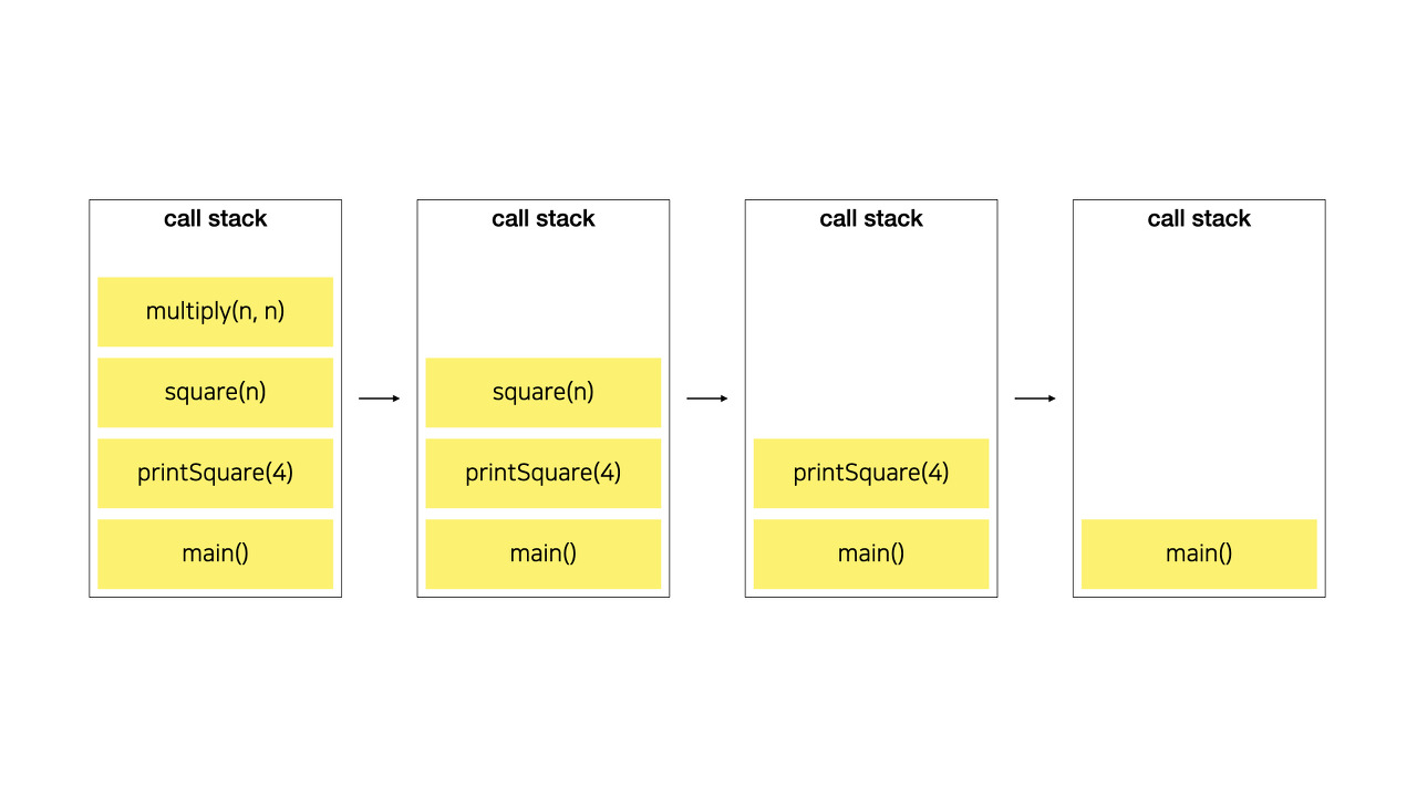 작업을 완료하면 하나씩 pop 되면서 다시 printSquare까지 돌아옵니다. console.log가 실행되면 리턴은 보이지 않지만, 암묵적으로 리턴됩니다.