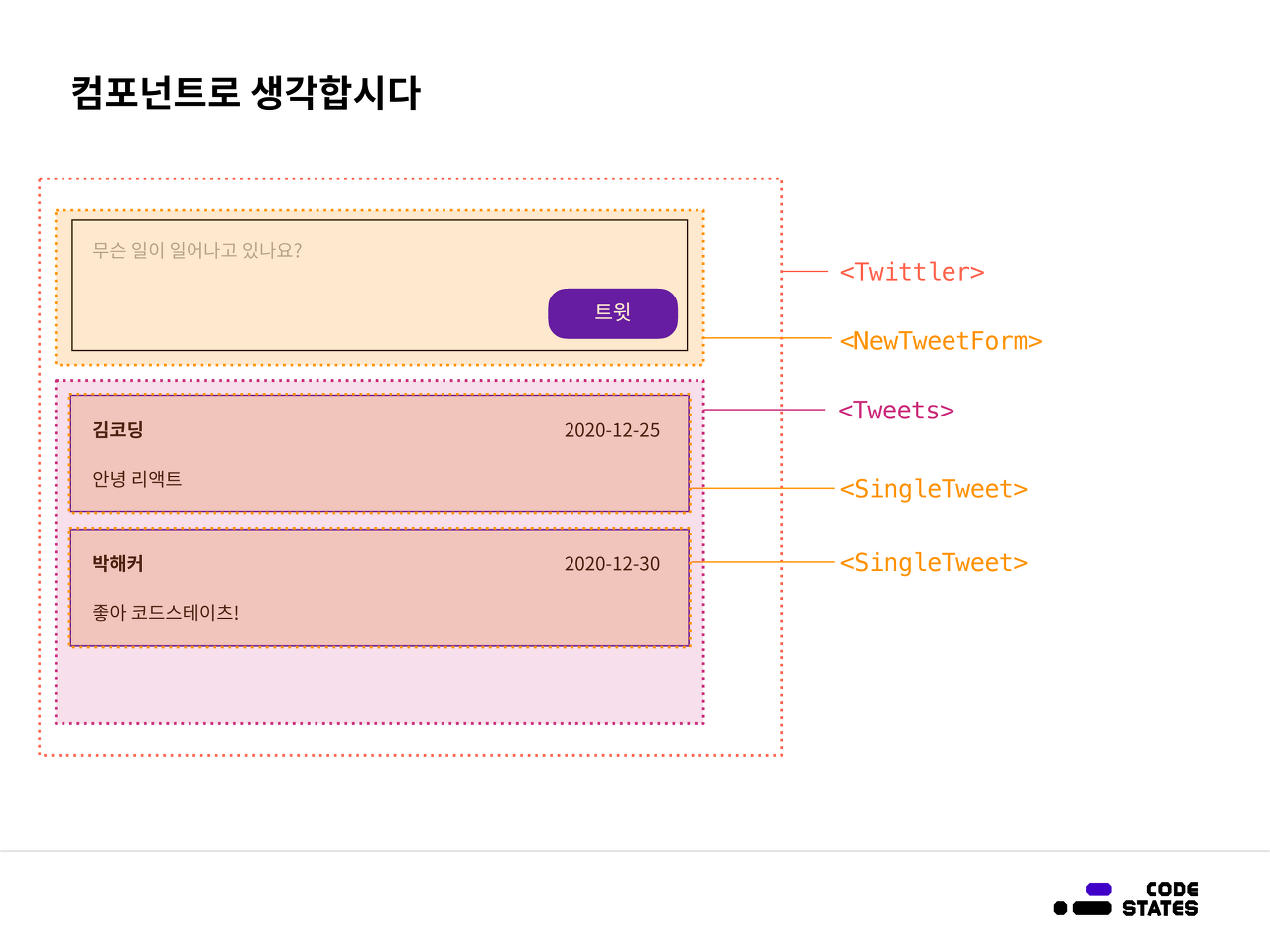 이 원칙은 매우 중요합니다. 얼마나 중요하냐면, 단방향 데이터 흐름(one-way data flow)이라는 키워드가 React를 대표하는 설명 중 하나일 정도입니다. 또한 컴포넌트는 props를 통해 전달받은 데이터가 어디서 왔는지 전혀 알지 못합니다.