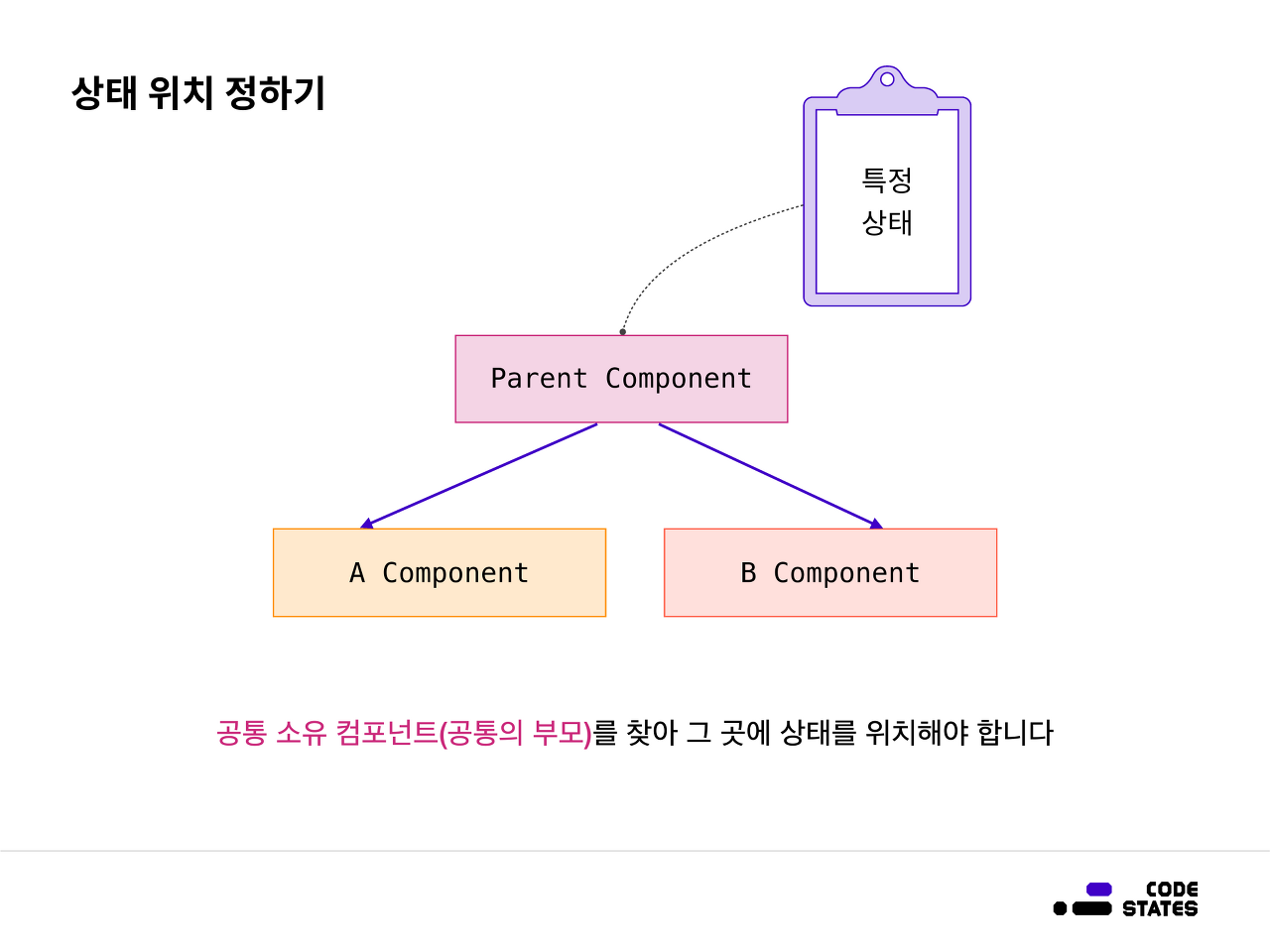 상태가 특정 컴포넌트에서만 유의미하다면, 특정 컴포넌트에만 두면 되니까 크게 어렵지 않지만, 만일 하나의 상태를 기반으로 두 컴포넌트가 영향을 받는다면 이때에는 공통 소유 컴포넌트를 찾아 그곳에 상태를 위치해야 합니다.